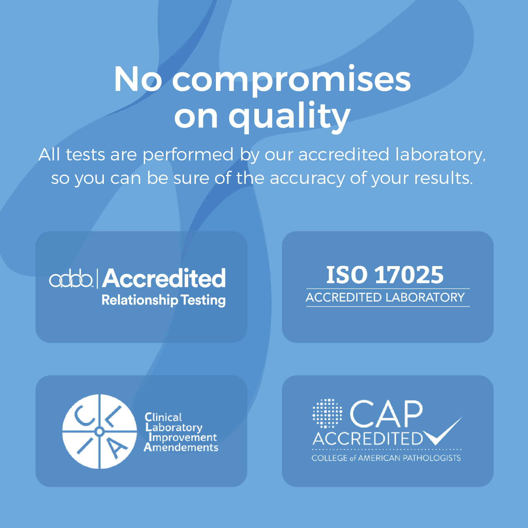Accuracy guaranteed. All tests performed TWICE in our AABB, ISO 17025 & CLIA accredited laboratory.